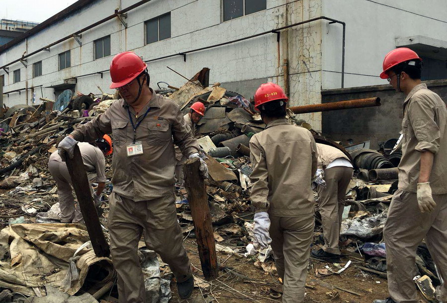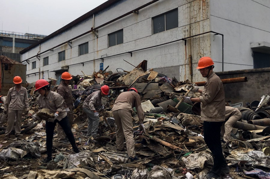 此次義務(wù)勞動(dòng)的重點(diǎn),是對(duì)公司廢鋼材庫(kù)垃圾進(jìn)行清理、分類。當(dāng)天雖然已過立秋節(jié)氣,但氣溫仍達(dá)到了31攝氏度,大家頭頂烈日,不畏高溫悶熱,挽起衣袖,把垃圾一點(diǎn)一點(diǎn)分撿出來,再按照廢鐵、玻璃鋼、塑料、橡膠等分類堆放。每一名參加活動(dòng)的黨員干部積極主動(dòng),通力協(xié)作,汗水濕透了衣服,卻絲毫沒有降低大家勞動(dòng)的熱情;即使是看似柔弱的女同事們,也干勁十足,絲毫不遜色于男同事。經(jīng)過一個(gè)半小時(shí)的辛勤勞動(dòng),廢鋼材庫(kù)垃圾分類初顯成效,為垃圾規(guī)范化處理提供了條件。