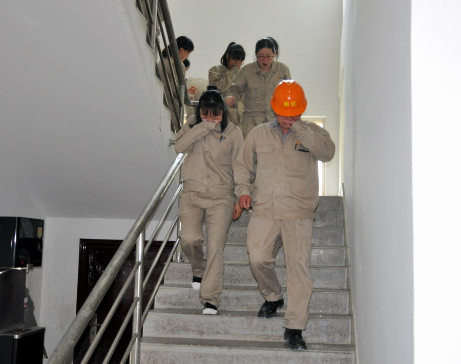 與此同時公司安環(huán)部查看現(xiàn)場后立即啟動消防應(yīng)急預(yù)案,用廣播通知調(diào)度樓辦公室人員緊急撤離,并組織、引導(dǎo)人員有序疏散;各辦公室人員在公司義務(wù)消防員的組織下用衣服、毛巾捂著口鼻快速有序的從安全出口、疏散樓梯及疏散走道逃生,最后在緊急集合點集合。 5分鐘后明火被撲滅,火情得以控制,演練活動結(jié)束。