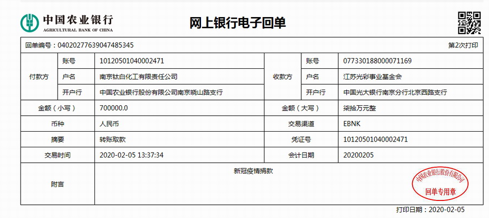 截止2020年2月3日17:00,南京鈦白公司共收到643人次員工捐款,累計募集善款135970元;另公司抗疫領(lǐng)導(dǎo)小組還以南京鈦白公司名義捐款70萬元。